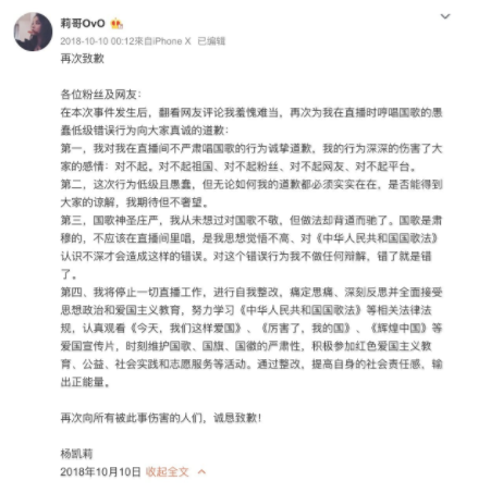 莉哥過去在抖音平台上擁有3000萬的粉絲追蹤,更有個「莉三萬」的外號,因為據陸媒報導指出,莉哥在某直播平台上表示刷禮物有滿3000的話就可以加本人的微信好友。然而在去年10月7日時,莉哥因為「戲謔國歌」遭到網友檢舉,一星期後更以觸犯「國歌法」遭拘留5日,甚至遭到封殺包括莉哥的直播間、凍結直播帳號,過去作品都遭到下架,事後她也在個人微博上發文鄭重道歉,但自從該篇貼文後莉哥就沒有更新了,之後更傳出莉哥曾被虎牙平台高層「潛規則」,影片被全網瘋傳,種種負面消息曝光後也讓莉哥的名聲一落千丈。
